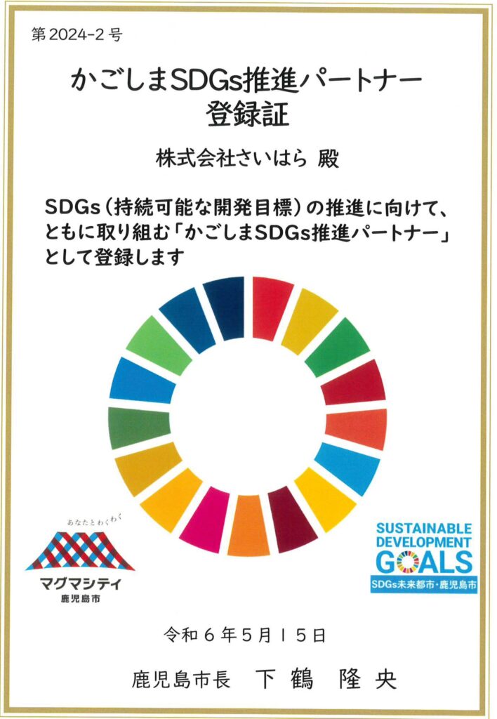 鹿児島市のSDGsの推進に取り組む企業として、当社が「かごしまSGDs推進パートナー」の登録を受けました。