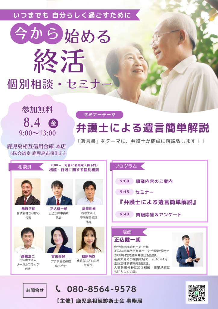鹿児島市内で活躍する終活に強い弁護士や司法書士、税理士等の専門家が集まり無料で相談に応じます。また、無料相談と併せて弁護士による遺言についてのセミナーも同時開催します。